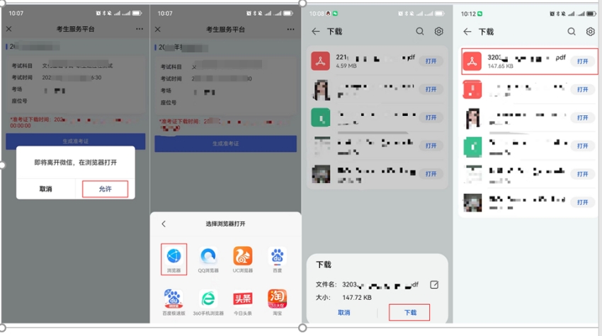 6.3.2 安卓手机:点击“允许”按钮后,选择指定的浏览器软件后,再次点击“下载”按钮,等待一段时间后,pdf文件即下载至手机,此时可以在浏览器的下载列表中打开文件,也可以发送文件给打印店以进行打印。