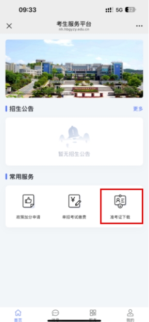 6.1点击“首页”按钮回到主页,在“常用服务”里点击“准考证下载”,进入准考证页面,如下图所示: