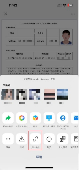 6.3.1 苹果手机:点击右上角的“...”按钮后,在浮窗内点击“复制链接”,在微信内粘贴链接。点击访问该链接后,随时可以查看自己的准考证信息,也可以将该链接发送给打印店以进行打印。