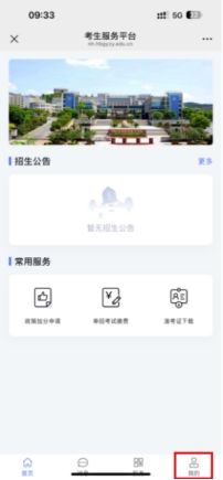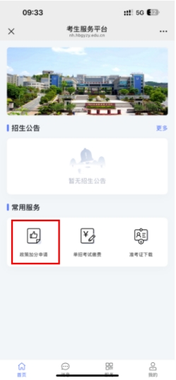 点击考生的“首页”按钮回到主页,在“常用服务”里点击“政策加分申请”,进入加分申请页面,在阅读完考试须知之后,进入加分材料提交页面上传加分材料,如下图所示(无符合加分条件的考生可直接跳过政策加分申请,选择缴费模块):